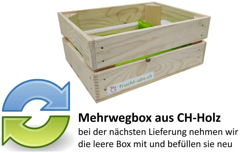 Wir liefern in einer schönen Mehrwegbox aus Schweizer Holz, welche bei der Folgelieferung abgeholt und neu befüllt wird.