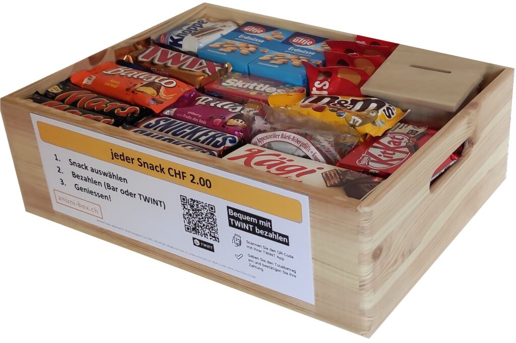 Was Sie vielleicht nicht erwartet hätten: die Früchte-Box war zu Beginn ein Nebenprodukt. Ich habe mich Mitte 2021 mit der Znüni-Box im Nebenerwerb selbstständig gemacht. Die Znüni-Box war eine Holzbox mit Snacks, welche bei Unternehmen im Pausenraum platziert wurde – die Mitarbeitenden konnten sich bei Bedarf bedienen und Ihren Snack direkt in Bar oder per Twint-Überweisung bezahlen.